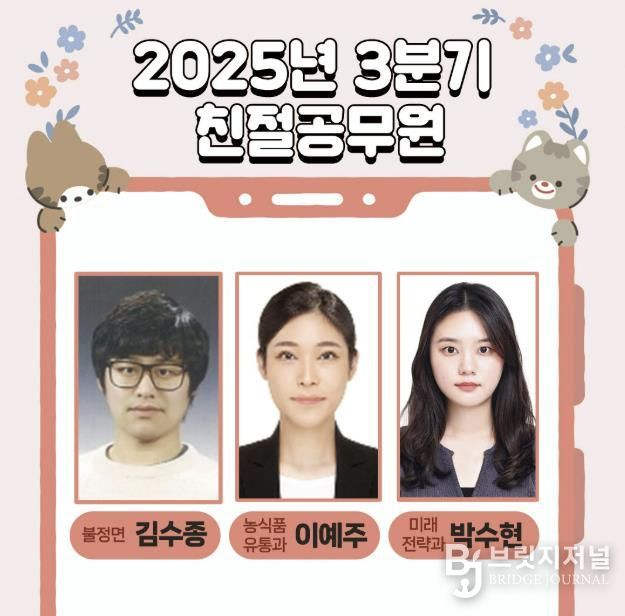 브릿지저널 김경미 기자 | 충북 괴산군은 2025년 3분기 친절공무원으로 김수종 주무관(불정면사무소), 이예주 주무관(농식품유통과), 박수현 주무관(미래전략과)을 선정했다고 밝혔다.