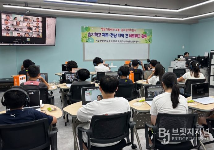 브릿지저널 정보영 기자 | 제주도교육청 하례초등학교는 9월 30일 전남 순천인안초등학교와 함께 비대면 화상회의 플랫폼(ZOOM)을 활용해 생태관광을 주제로 공동수업을 진행했다.