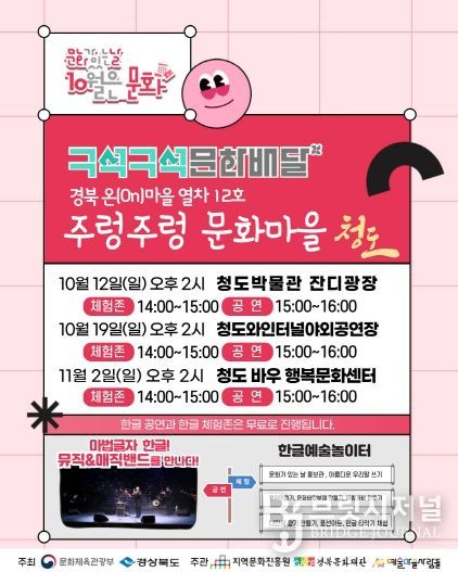 브릿지저널 정보영 기자 | 2025 문화가 있는 날 '구석구석 문화배달' 경북 온(On)마을 열차 12호 청도군 ‘주렁주렁 문화마을’가 10월 문화의 달을 맞아 총 3회의 공연을 선보인다. 이번 행사는 문화체육관광부와 경상북도가 주최하고, 지역문화진흥원·경북문화재단·예술마을사람들이 주관하며, 청도군과 협력해 진행된다.