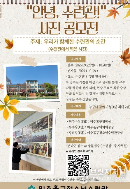 브릿지저널 김경미 기자 | 인천 미추홀구청소년수련관은 수련관 이전을 앞두고 지난 30여 년간의 추억을 함께 기록하기 위해 ‘안녕, 수련관’ 사진 공모전을 진행하고 있다고 2일 밝혔다.