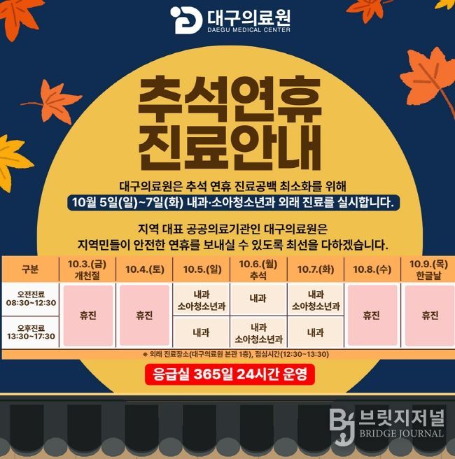 브릿지저널 김진석 기자 | 대구의료원이 추석 연휴 기간(10.3.~10.9.) 응급실 운영을 강화하고, 10월 5일(일)부터 7일(화)까지 내과·소아청소년과 외래 진료를 실시한다.
