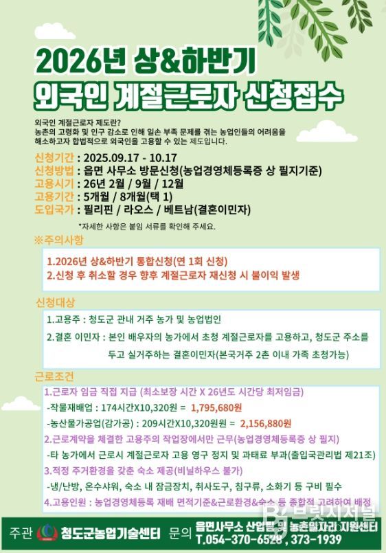 브릿지저널 정보영 기자 | 청도군은 농촌 인구감소와 고령화로 인한 농번기 일손 부족 문제 해소를 위해 9월 17일부터 10월 17일까지 '2026년 상·하반기 외국인 계절근로자' 고용 희망농가 수요조사를 실시하고 있다.