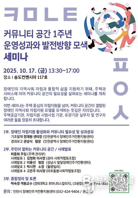 세미나 참여를 원하는 이들은 인천시장애인주거전환지원센터로 전화 문의하거나 포스터 내 큐알 코드를 이용해 신청하면 된다.