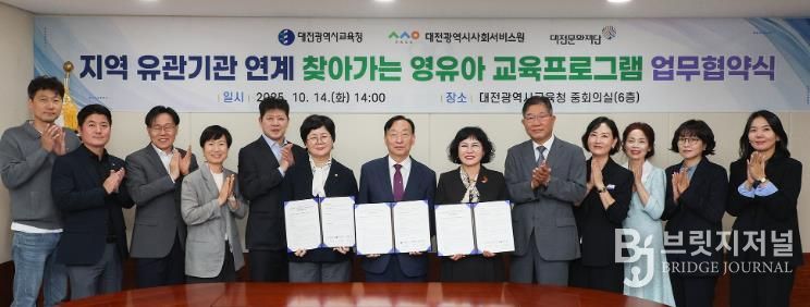 브릿지저널 정보영 기자 | 대전시교육청은 10월 14일 대전광역시사회서비스원 및 대전문화재단과'지역 유관기관 연계 찾아가는 영유아 교육프로그램'운영 업무협약을 체결했다고 밝혔다.