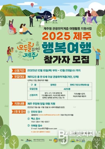 브릿지저널 정보영 기자 | 제주특별자치도와 제주관광공사는 오는 16일부터 29일까지 관광에서 소외되기 쉬운 취약계층에게 여행의 기회를 제공하기 위한 ‘제주 행복 여행’ 사업을 추진한다고 15일 밝혔다.