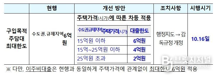 수도권·규제지역에 적용되는 주택구입목적 주담대의 대출한도(現 6억원)를 주택가격(시가) 수준에 따라 차등 적용한다. 수도권 · 규제지역의 ➊시가 15억원 이하 주택의 주담대 한도는 현행과 동일한 6억원, ➋시가 15억원 초과~25억원 이하 주택은 4억원, ➌시가 25억원 초과 주택은 2억원으로 대출한도를 차등 적용한다. 이를 통해 수도권·규제지역 내에서 대출을 활용한 고가주택 구입 수요를 보다 강력하게 관리해 나갈 예정이다.