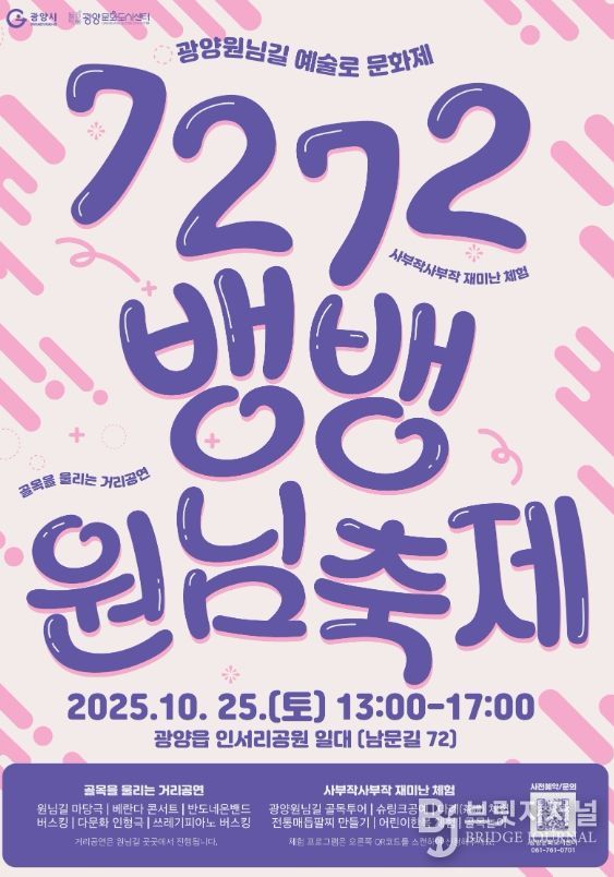 브릿지저널 김경미 기자 | 광양문화도시센터는 오는 10월 25일 금요일 오후 광양읍 인서리공원 일대에서 광양원님길 브랜드 축제 ‘7272뱅뱅원님축제’를 개최한다고 밝혔다.