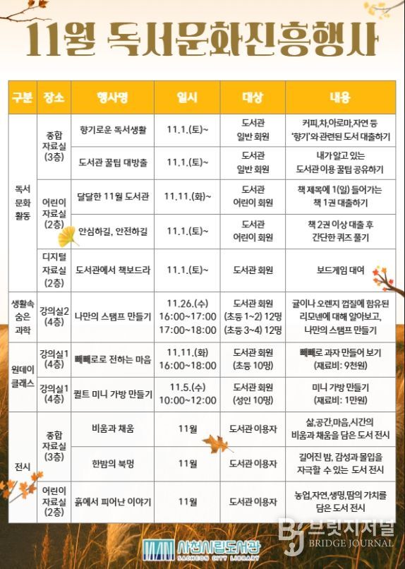 브릿지저널 김경미 기자 | 사천시는 사천시립도서관에서 11월 한 달 동안 책과 함께 여유로운 시간을 보내며 감성을 채울 수 있는 다양한 독서문화행사와 체험 프로그램을 운영한다고 17일 밝혔다.