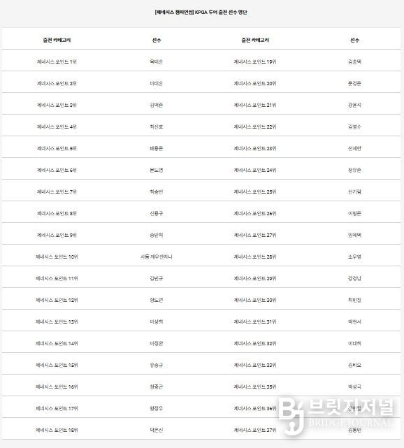 제네시스 포인트 1위 옥태훈(27.금강주택)을 비롯해 2위 이태훈(35.캐나다), 3위 김백준(24.속초아이), 4위 최진호(41.COWELL), 5위 배용준(25.CJ), 6위 문도엽(34.DB손해보험), 7위 최승빈(24.CJ), 8위 신용구(34.금강주택), 9위 송민혁(21.CJ), 10위 사돔 깨우깐자나(27.태국)까지 제네시스 포인트 TOP10 선수들과 36위 정한밀(34.경희), 37위 김동민(27.NH농협은행)까지 제네시스 포인트 상위 36명이 참가자 명단에 이름을 올렸다.