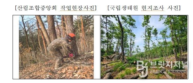 또한, 작업현장 사진과 현지조사 사진을 비교한 결과, 큰나무 위주의 간벌로 인해 식생이 단순화되고 산림 구조가 훼손된 정황이 확인됐다.