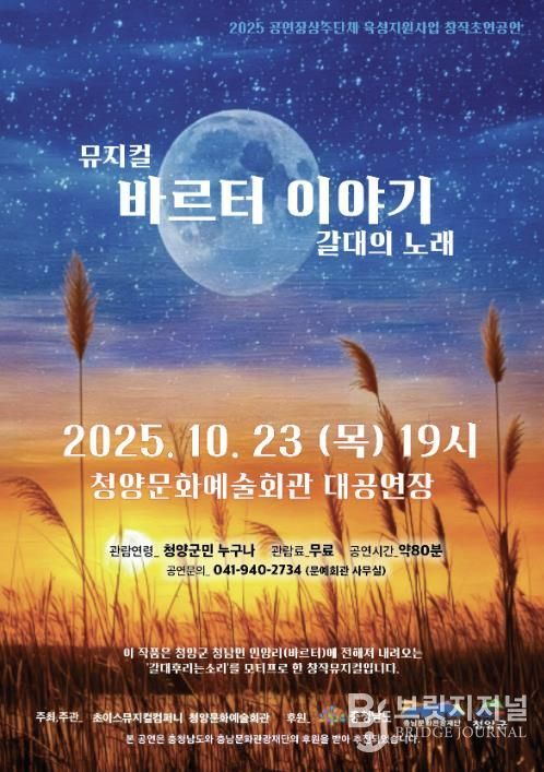 이 공연은 ‘2025 충남공연장 상주단체 육성지원사업’의 일환으로 제작됐으며 청양문화예술회관과 초이스뮤지컬컴퍼니(대표 최인양, 장현아)가 주최·주관하고 충청남도와 충남문화관광재단, 청양군이 후원한다.