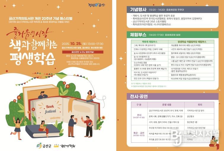 또한, 제19회 도서관 책축제 및 제4회 평생학습 어울림 마당 전시·체험부스가 운영돼 금산기적의도서관 20년의 과거·현재·미래를 보여주고 금산군 평생학습 결과물을 선보인다.