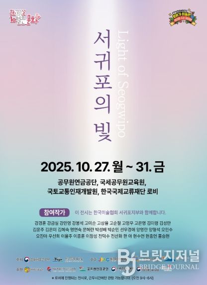 ‘예술이다 서귀포, 혁신이 주는 달콤함’의 피날레를 함께하는 한국미술협회 서귀포지부와 함께하는 특별기획전시 '로비가 미술관: 서귀포의 빛'이 27일(월)부터 31일(금)까지 추진된다. 전시는 공무원연금공단, 국세공무원교육원, 국토교통인재개발원, 한국국제교류재단 로비에서 동시에 펼쳐지며, ‘서귀포의 빛’이라는 주제로 아름답게 빛나는 서귀포의 모습과 색감을 작가들의 다양한 감성으로 표현된 작품을 선보인다. 매일 스쳐지나가는 로비의 풍경에서 영감이 가득한 일터로의 변화를 느낄 수 있도록 기획했다.