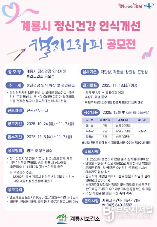 브릿지저널 정보영 기자 | 계룡시는 정신건강 홍보주간(10. 10.∼24.)을 맞아 시민이 직접 참여하는 ‘계룡시 정신건강 인식개선 캘리그라피 공모전’을 개최한다.