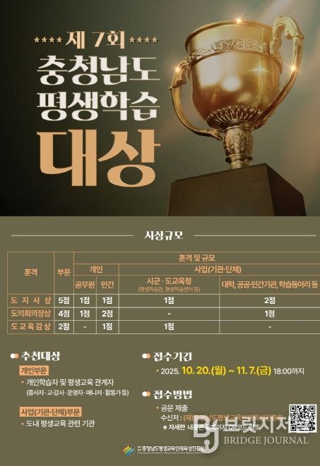 브릿지저널 정보영 기자 | 충남평생교육인재육성진흥원은‘2025년 제7회 충남 평생학습대상’표창 공모를 실시한다고 23일 밝혔다.