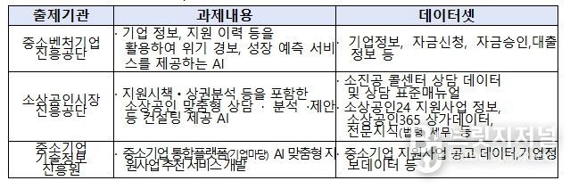 이번 공모전에 과제를 출제하는 기관은 총 3곳*으로 ▲중소기업 성장·위험 예측, ▲소상공인 맞춤형 전문상담(컨설팅), ▲중소기업 통합플랫폼 기반 지원사업 추천 3개 분야 과제를 제출하고 기관들이 보유한 양질의 데이터를 제공한다. 각 기관에서 제공하는 데이터는 가공 및 비식별화해 제공될 예정이다.