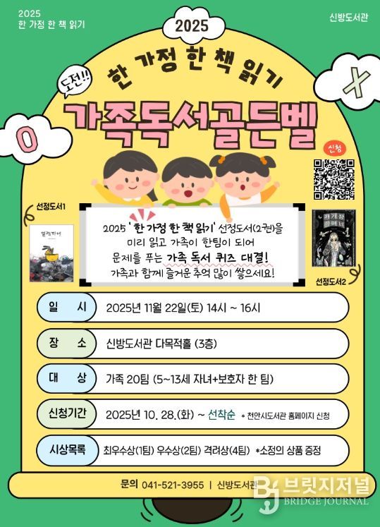 브릿지저널 정보영 기자 | 천안시 신방도서관은 내달 22일 가족과 함께하는 ‘가족 독서 골든벨’을 운영한다고 28일 밝혔다.