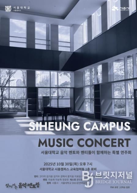 브릿지저널 김경미 기자 | 서울대학교 시흥캠퍼스와 시흥시가 협력하는 ‘서울대학교 음악 멘토-멘티 특별 연주회’가 10월 30일 오후 7시, 서울대학교 시흥캠퍼스 교육협력동 1층 로비(시흥시 서울대학로 173)에서 열린다.
