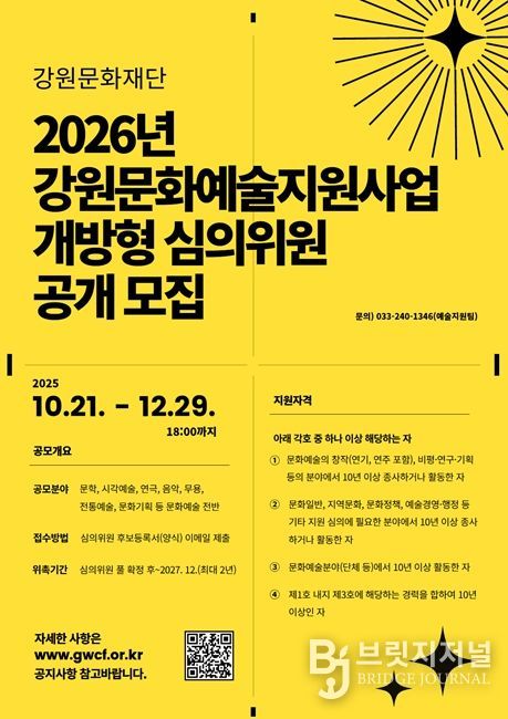 브릿지저널 윤나영 기자 | 강원문화재단은 2026년도 강원문화예술지원사업의 심의를 함께할 개방형 심의위원 후보군을 오는 12월 29일까지 공개 모집한다고 밝혔다.