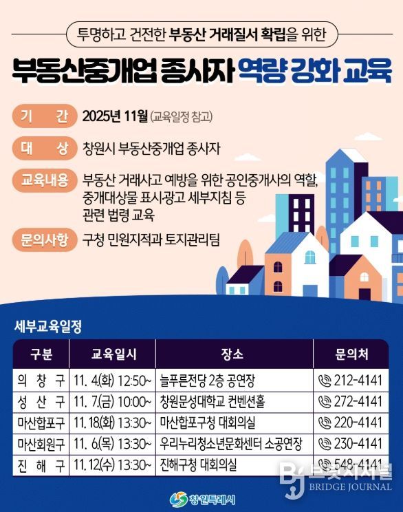 이번 교육은 창원시 부동산중개업종사자 1,900여 명을 대상으로 11월 4일부터 18일까지 창원시 5개 구청별로 실시된다.