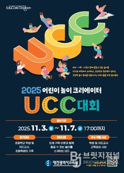 브릿지저널 정보영 기자 | 대전시교육청은 친구들과 함께 놀이를 창작 ‧ 체험 ‧ 향유‧ 공유함으로써 자발적이고 건전한 학생 놀이문화를 확산하기 위해 2025학년도 '어린이 놀이 크리에이터' UCC 대회를 11월 3일부터 7일까지 실시한다고 밝혔다.