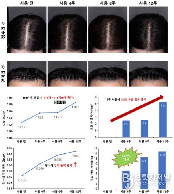 또한, 12주 후 ▲모발 밀도는 1cm2당 112.7±15.7개에서 118.6±14.9개로 5.9개(5.2%) 증가했고 ▲두피 탄력도는 14.9% 향상 ▲모발 길이는 97㎛(17.1%) 증가 ▲모발 굵기는 12㎛(12.6%) 증가하는 등 전반적인 모발 건강 지표가 고르게 향상됐다.