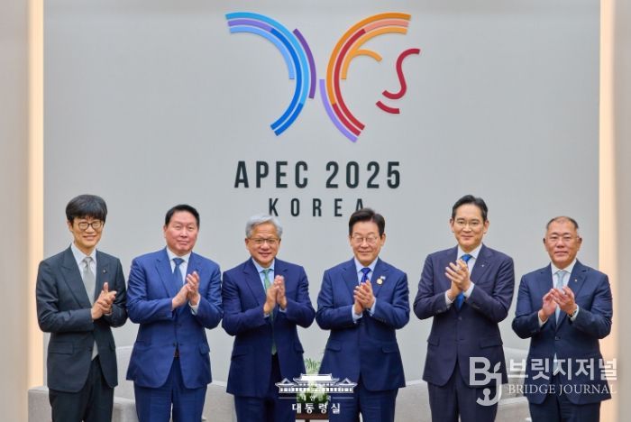 브릿지저널 김경미 기자 | 이재명 대통령은 10월 31일 오후 2시 경주 APEC 정상회의를 계기로 방한한 젠슨 황 엔비디아 대표를 만나, 대한민국 AI 인프라를 비롯한 생태계 전반의 혁신 방안에 대해 의견을 교환했다. 이 자리에는 삼성전자 이재용 회장, SK 최태원 회장, 현대차그룹 정의선 회장, 네이버 이해진 의장이 함께했다.