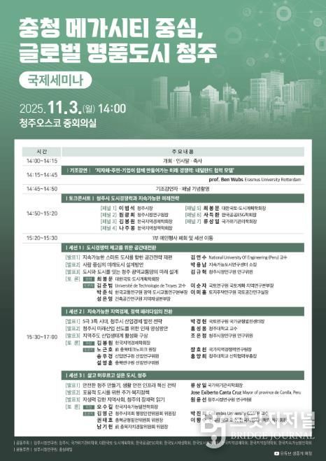 브릿지저널 김경미 기자 | 청주시정연구원은 3일 ‘충청 메가시티 중심, 글로벌 명품도시 청주’라는 제목으로 청주 오스코(OSCO)에서 국제세미나를 개최했다.