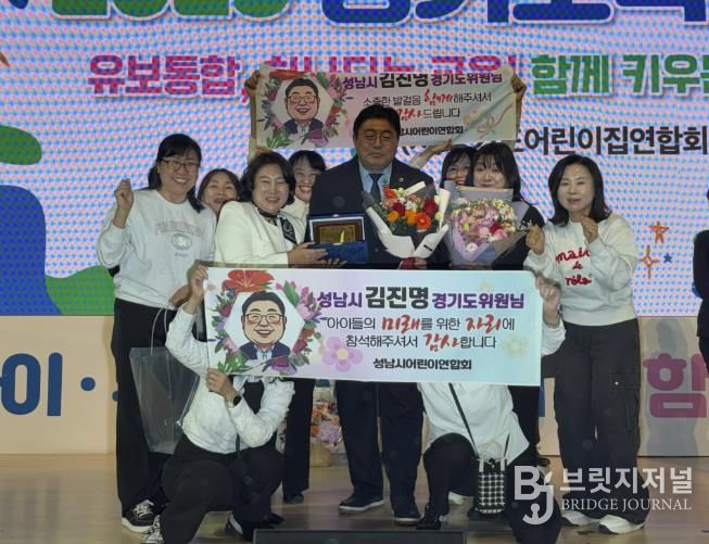 브릿지저널 김경미 기자 | 경기도의회 여성가족평생교육위원회 김진명 의원(더불어민주당, 성남6)은 10월 30일 용인 실내체육관에서 (사)경기도어린이집연합회 주최·주관으로 열린 '2025년 경기보육인대회'에서 경기도 보육 환경 개선에 기여한 공로를 인정받아 공로패를 수상했다.