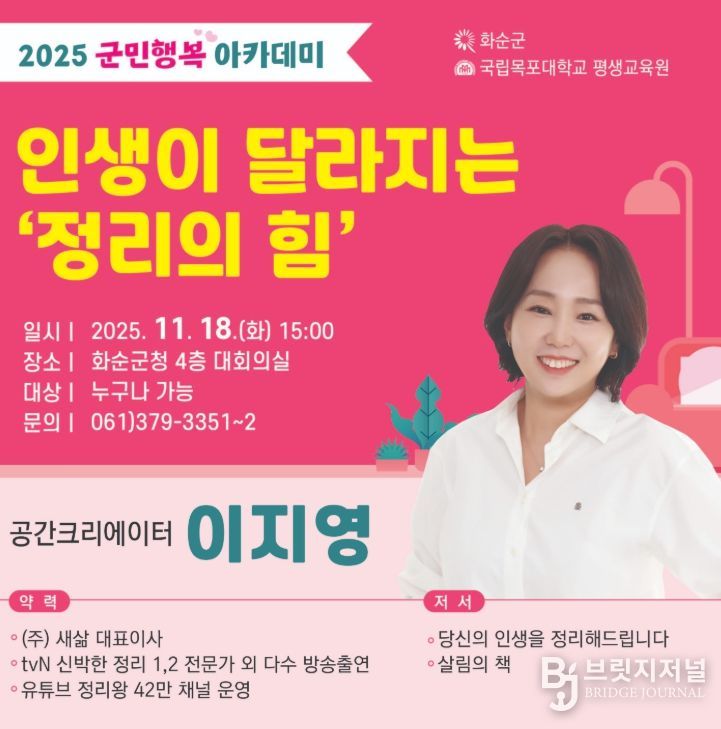 브릿지저널 김경미 기자 | 화순군은 오는 11월 18일 오후 3시, 화순군청 4층 대회의실에서 2025 군민행복 아카데미 9회차 강연을 개최한다고 밝혔다.