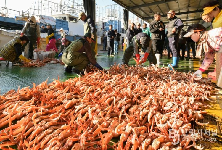 브릿지저널 정보영 기자 | 겨울철 최고의 수산물로 꼽히는 영덕대게가 5개월간의 금어기를 마치고 지난 3일 강구항 위판장에서 올해 처음으로 위판됐다.