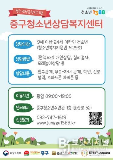 한편, 중구청소년상담복지센터는 청소년 상담 전문 기관으로, 만 9~24세 청소년이라면 누구나 무료로 이용할 수 있다. 이용 방법 등 더 자세한 사항은 센터로 문의하면 된다.