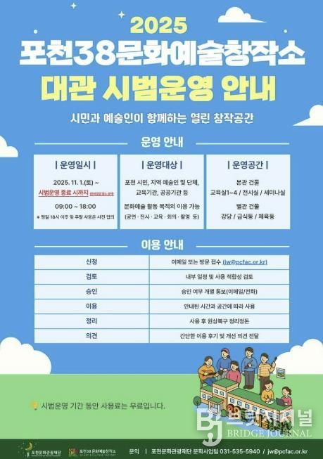 이중효 포천문화관광재단 대표이사는 “이번 시범운영은 시민과 예술인이 보다 쉽게 창작소 공간을 활용할 수 있도록 운영체계를 사전에 점검하고 보완하는 과정”이라며 “이용자 의견을 폭넓게 반영해 포천38문화예술창작소가 지역 문화예술의 중심지로 자리매김할 수 있도록 노력하겠다”고 밝혔다.