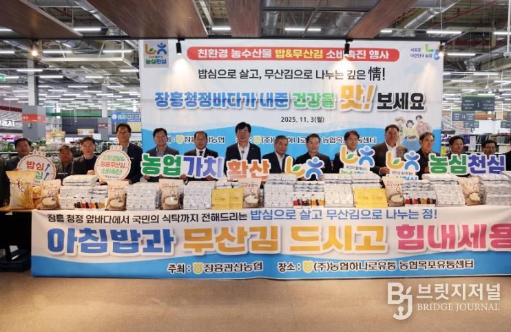 브릿지저널 김경미 기자 | 장흥군은 3일 목포유통센터에서 장흥관산농협, 장흥무산김㈜과 협업으로 ‘친환경 농수산물 밥&무산김 소비촉진 행사’를 열었다고 밝혔다.