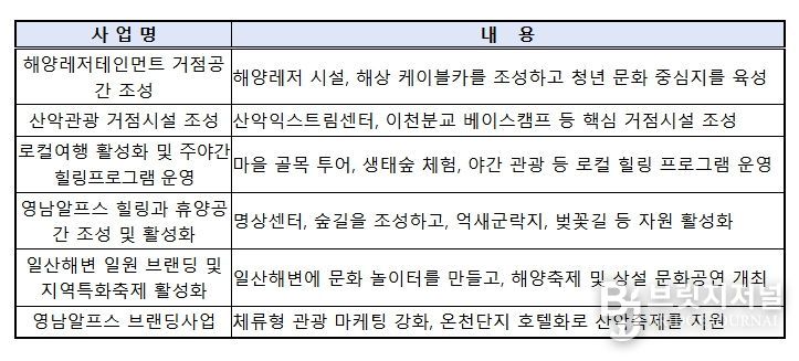 울산은 ‘일산해수욕장’ 등 해양자원과 ‘영남알프스’ 산악자원을 연계하여 ‘하루 더 머무는 체류형 복합레저도시’ 조성을 목표로 한다. 이를 통해, 제조업 중심의 산업구조를 고용친화적 관광산업으로 다변화하여 지역경제 활성화를 도모한다.