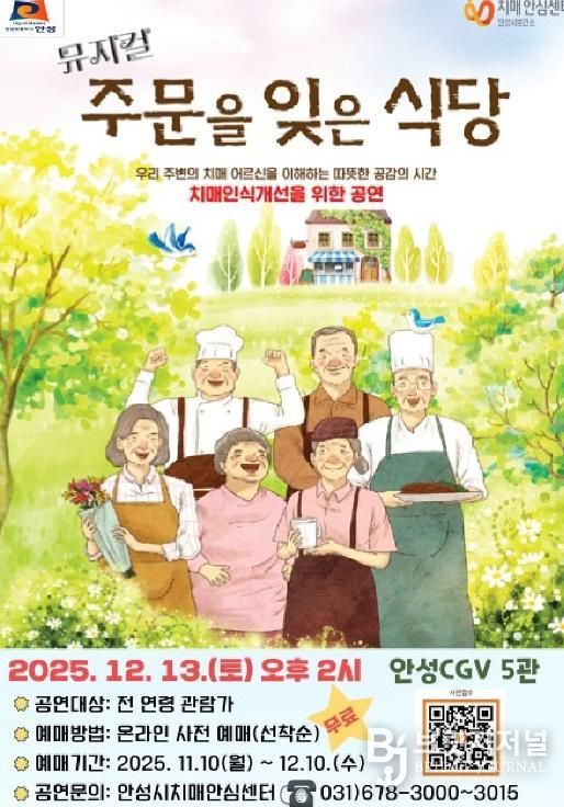 브릿지저널 김경미 기자 | 안성시보건소 치매안심센터는 오는 12월 13일 오후 2시, 안성 CGV에서 치매에 대한 올바른 이해와 공감 확산을 위한 치매인식개선 뮤지컬 '주문을 잊은 식당'공연을 무료로 개최한다.