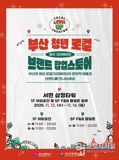 브릿지저널 윤나영 기자 | 부산시와 부산경제진흥원은 오늘(12일)부터 16일까지 5일간 서면 삼정타워에서 '2025 부산 청년 로컬 브랜드 팝업스토어'를 개최한다고 밝혔다.