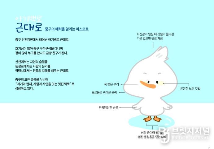 중구청은 지난 10월까지 ‘아기백로 근대로’ 리뉴얼 제작 용역을 통해 기본형 1종, 응용형 27종(축제형·동작형·감정형·SNS형 등)을 완성했으며, 이번 캐릭터는 귀엽고 따뜻한 이미지로 구민에게 친근하게 다가가는 ‘중구의 얼굴’ 역할을 하게 된다.