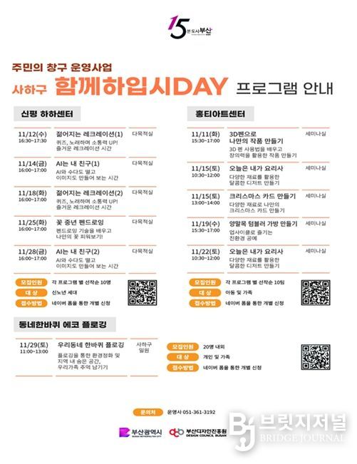 브릿지저널 윤나영 기자 | 부산시는 11월 한 달 동안 제2차 해피챌린지 생활권(신평·장림, 괘법·감전)에서 '주민의 창구 주민참여 리빙랩' 단원과 함께 기획한 프로그램을 운영한다고 밝혔다.