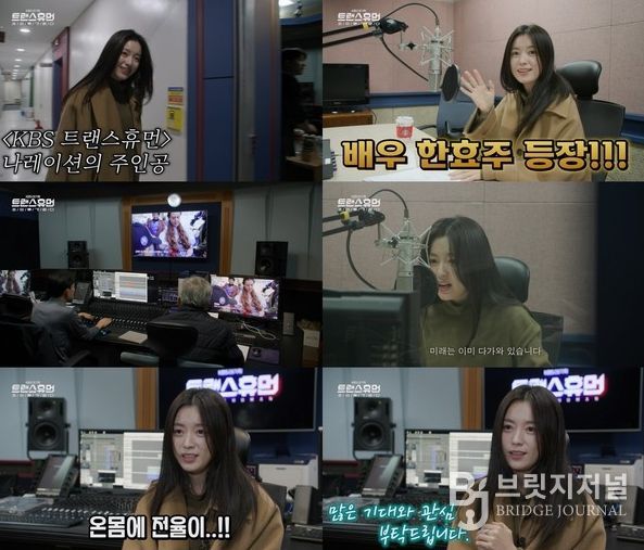 'KBS 다큐' 유튜브 채널에 올라온 메이킹 필름 영상에서는 밝은 표정으로 녹음실에 들어선 한효주가 꾸미지 않은 내추럴한 미모로 먼저 감탄을 자아냈다.