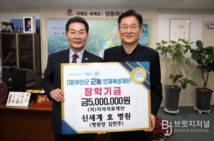 브릿지저널 윤나영 기자 | 의료법인 지석의료재단 신세계효병원은 지난 17일 부안군청을 방문해 부안군 근농인재육성재단(이사장 권익현)에 장학금 500만원을 기탁했다.