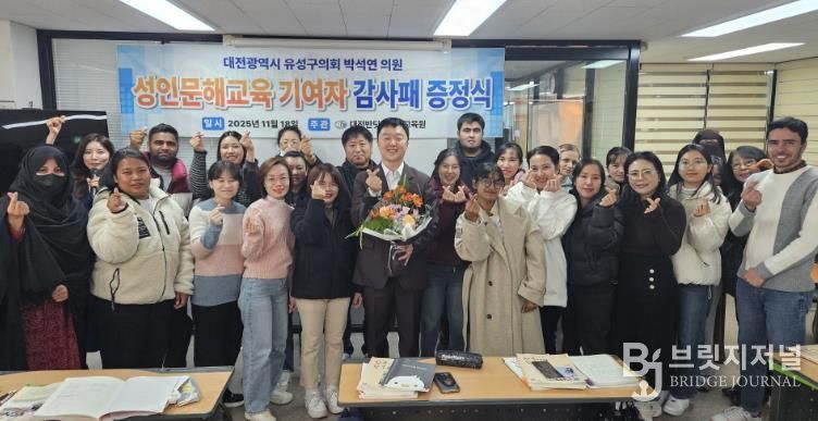브릿지저널 정보영 기자 | 대전광역시 유성구의회 박석연 의원(행정자치위원장)이 성인문해 교육 발전을 위해 노력한 공로로 감사패를 수상했다.