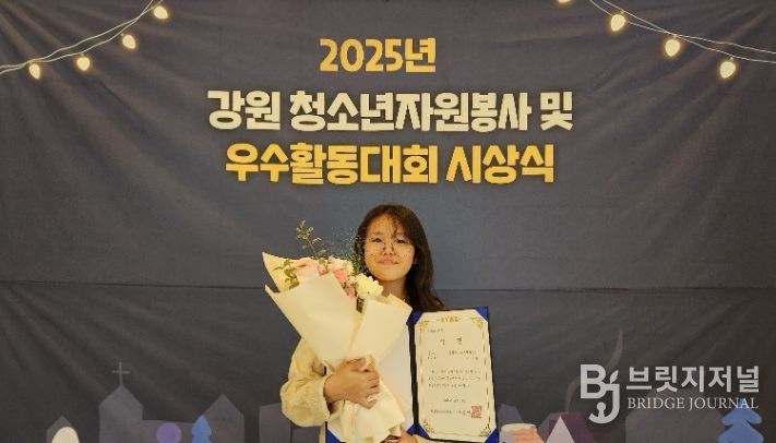 브릿지저널 윤나영 기자 | 영월군청소년문화의집봉사동아리 소속 이가윤(무릉초6)이 지난 14일 ‘2025년 강원 청소년자원봉사 및 우수활동대회’ 시상식에서 한국청소년활동진흥원 이사장상을 받았다.