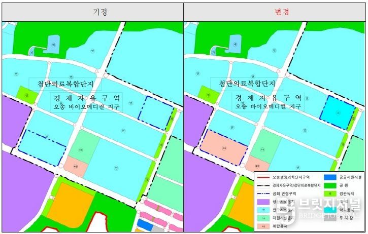 브릿지저널 김경미 기자 | 충북도는 11월 17일 오송첨단의료복합단지의 토지이용계획을 변경하는 개발실시계획이 승인됐다고 밝혔다. 이를 통해 오송읍 연제리 682-2, 682-3은 연구시설용지에서 복합용지로, 연제리 657은 연구시설용지에서 학교시설용지로 변경된다.