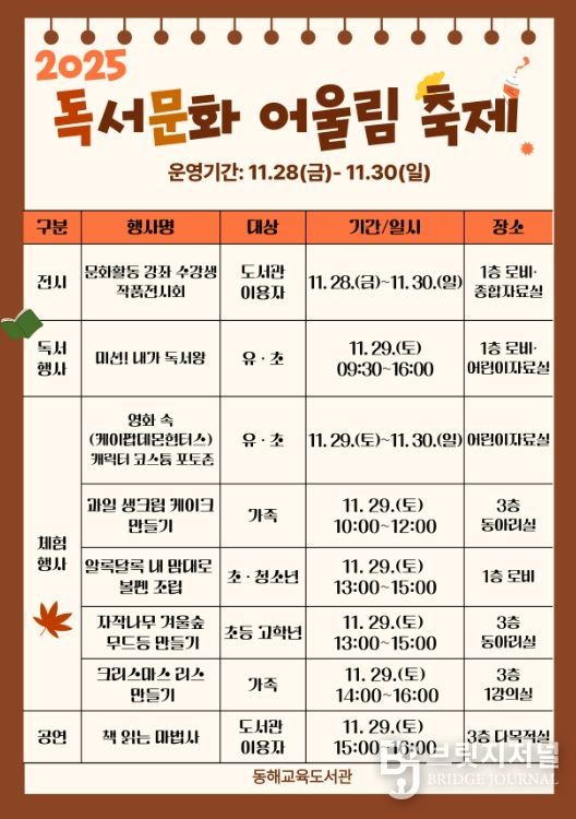 브릿지저널 윤나영 기자 | 동해교육도서관은 11월 28부터 30일까지 3일간 독서·문화 어울림 축제를 운영한다.