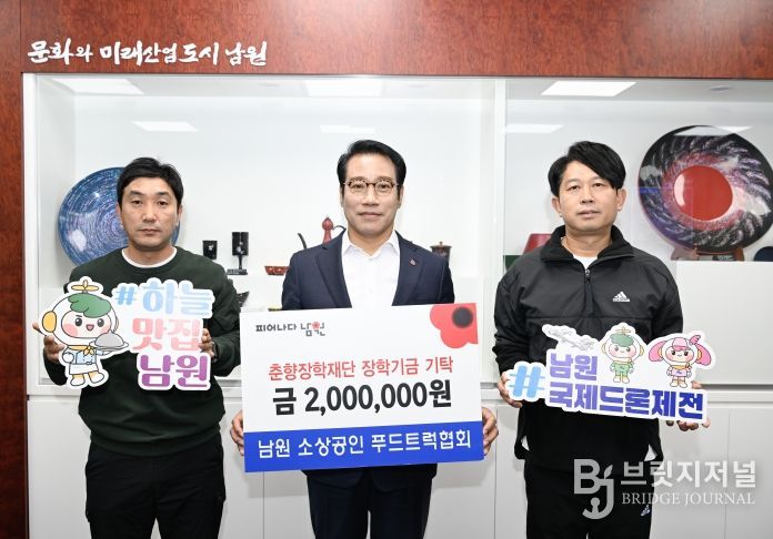 브릿지저널 윤나영 기자 | 남원시는 지난 10월 16일부터 19일까지 나흘간 남원종합스포츠타운 일원에서 열린 '2025 남원국제드론제전 with 로봇'이 성황리에 막을 내린 가운데, 행사에 참여한 전국푸드트럭소상공인협회 소속 15개 업체가 드론제전에서 얻은 수익금의 일부인 총 200만원을 춘향장학재단에 기탁했다.
