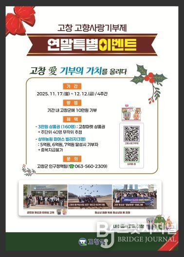 브릿지저널 윤나영 기자 | 고창군이 연말정산 기간을 앞두고 ‘고향사랑기부제 특별이벤트-고창愛 기부의 가치를 올리다’를 12월12일까지 운영한다고 20일 밝혔다.