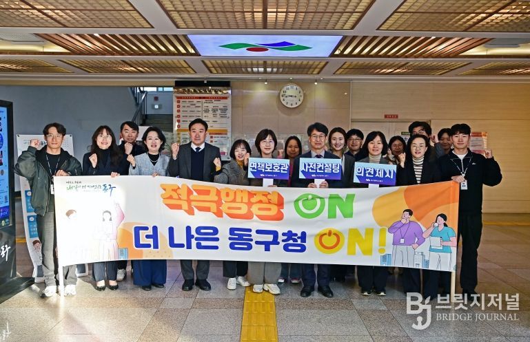 브릿지저널 김진석 기자 | 대구 동구청은 지난 19일 오전, 동구청 정문에서 직원들을 대상으로 ‘적극행정 실천다짐 캠페인’을 실시하며 공직사회 내 적극 행정 문화 확산에 나섰다.