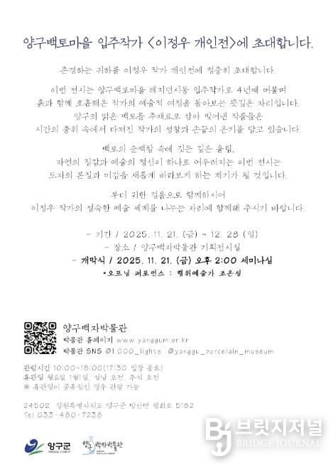 정두섭 양구백자박물관장은 “이번 전시는 흙이 만들어내는 자연의 질서와 작가의 감각이 조화롭게 어우러진 자리”라며, “이번 전시가 지역 도예문화의 창작 역량을 강화하고, 백토를 중심으로 한 양구만의 예술적 정체성을 널리 알리는 계기가 되기를 기대한다”고 말했다.