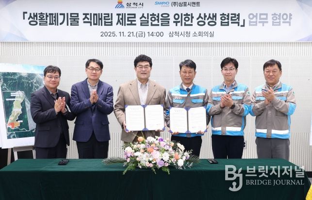 브릿지저널 윤나영 기자 | 삼척시는 11월 21일 향토기업 ㈜삼표시멘트와 ‘생활폐기물 매립 제로 실현을 위한 상생협력’ 업무협약을 체결했다.